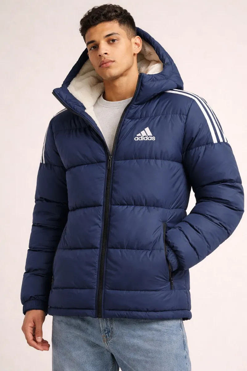 Experience ultimate warmth and iconic sporty style with this premium Adidas hooded puffer jacket, featuring a plush sherpa-lined hood for superior cold-weather insulation. Crafted for durable comfort and performance, this navy outerwear essential showcases the classic white 3-stripes branding, making it a versatile staple for any modern winter wardrobe.