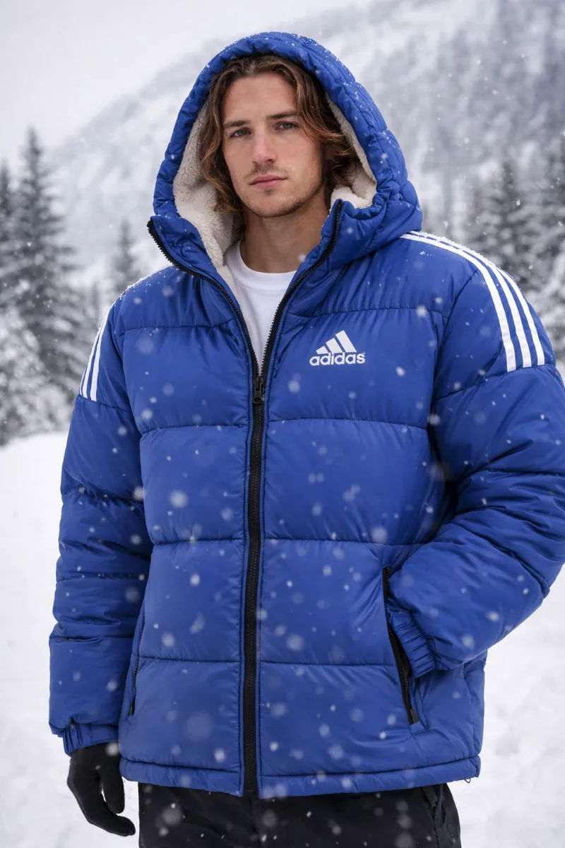 Brave the elements with this premium Adidas hooded puffer jacket, featuring a plush fleece-lined interior and the iconic three-stripe sleeve detailing for timeless style. Engineered with high-performance insulation and a durable quilted shell, this winter essential offers superior warmth and comfort for both urban streets and mountain trails.