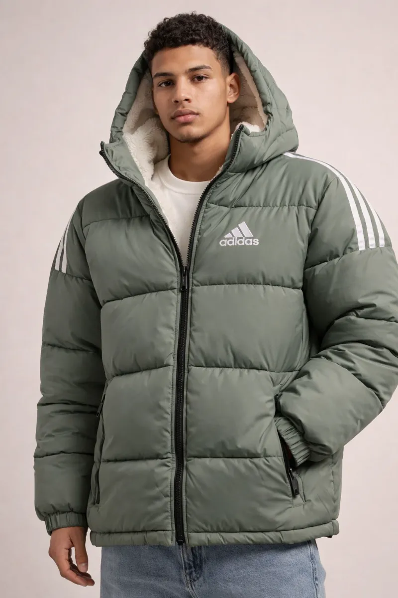 Experience ultimate winter warmth with this premium Adidas Forest Green Puffer Jacket, featuring a cozy sherpa-lined hood and iconic three-stripe sleeve detailing. Designed for high-performance insulation, this quilted jacket offers a sleek athletic silhouette and superior thermal protection for the modern urban explorer.